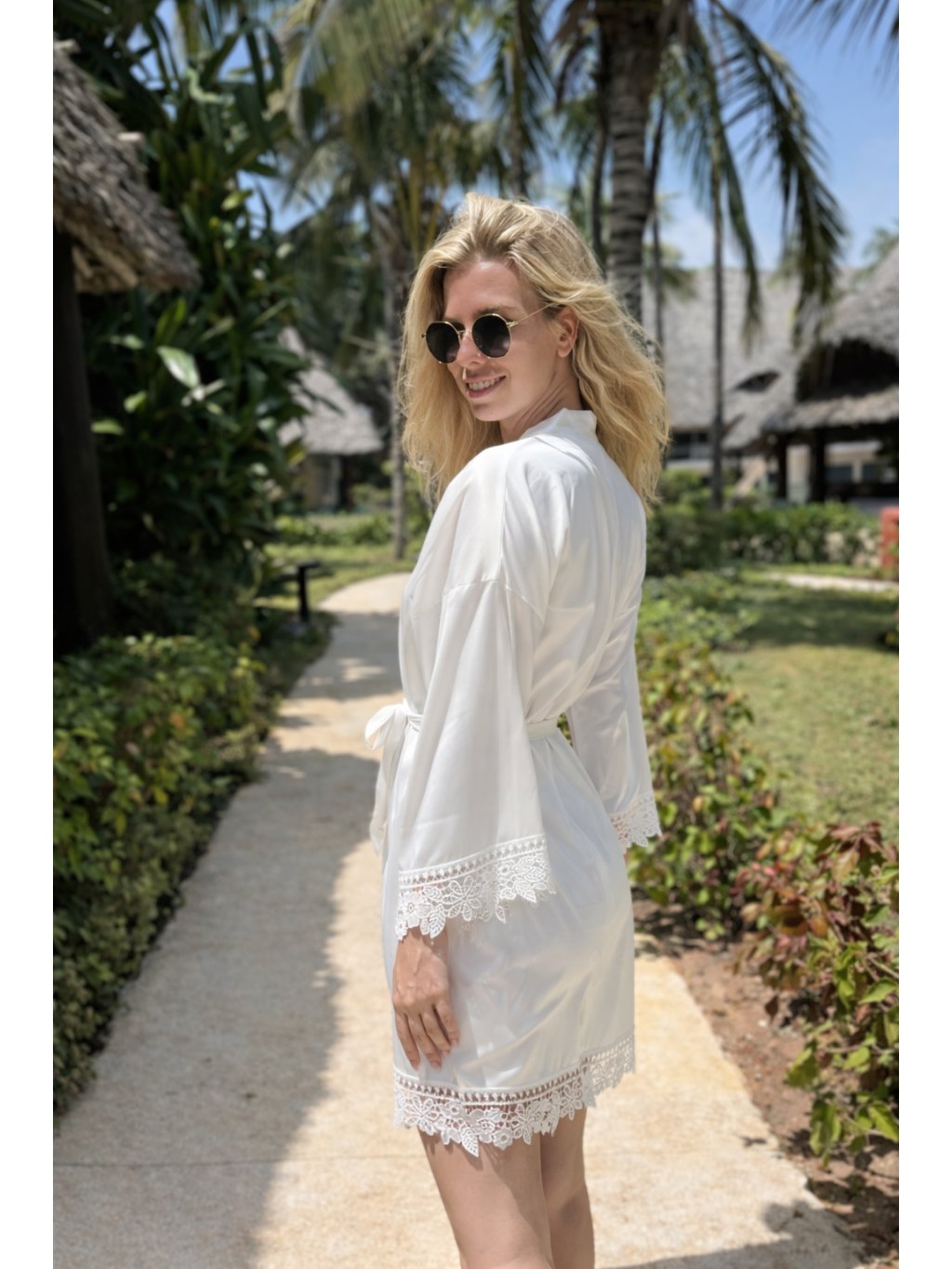 Krajkové zakončení rukávů a spodního lemu dodává župánku něžný, svatební nádech, zatímco pásek v pase umožní přizpůsobit střih přesně podle vaší postavy.