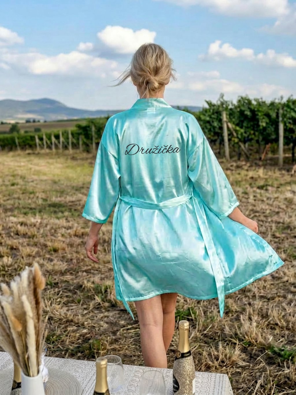 Mintový svatební župánek je osvěžující volbou pro nevěsty, svědkyně a družičky, které chtějí do svatebního dne vnést vzdušnost a jemnost. Tento župánek je vyroben z jemné mintově zelené látky, která přináší do svatebního outfitu dojem svěžesti a elegance.