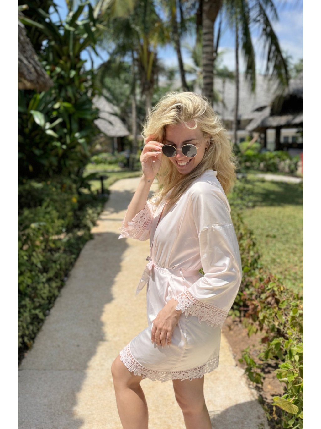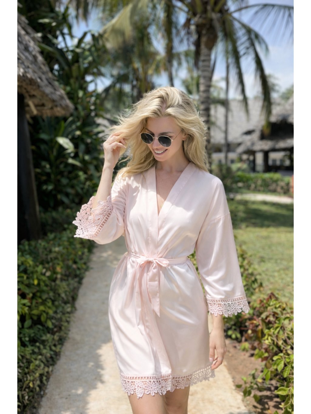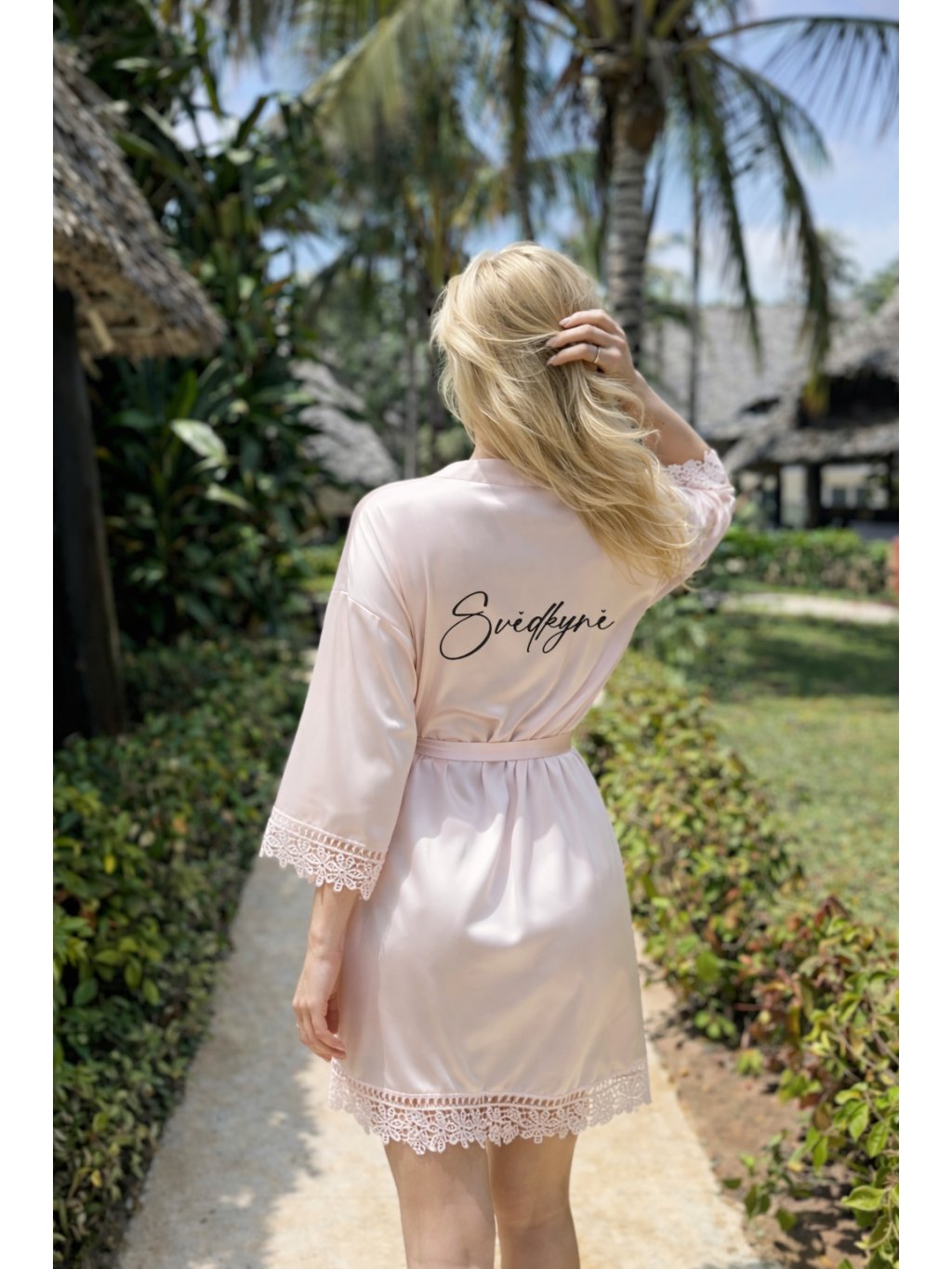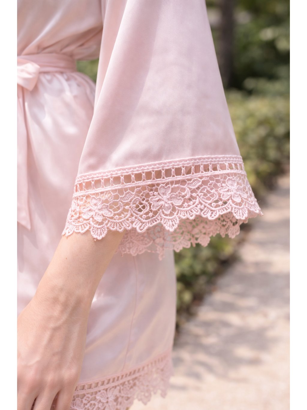 Krajkové zakončení rukávů a spodního lemu dodává župánku romantický detail, který vynikne při svatebních fotografiích i při každodenním nošení. Díky zavazování v pase si střih snadno přizpůsobíte podle své postavy.